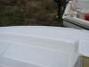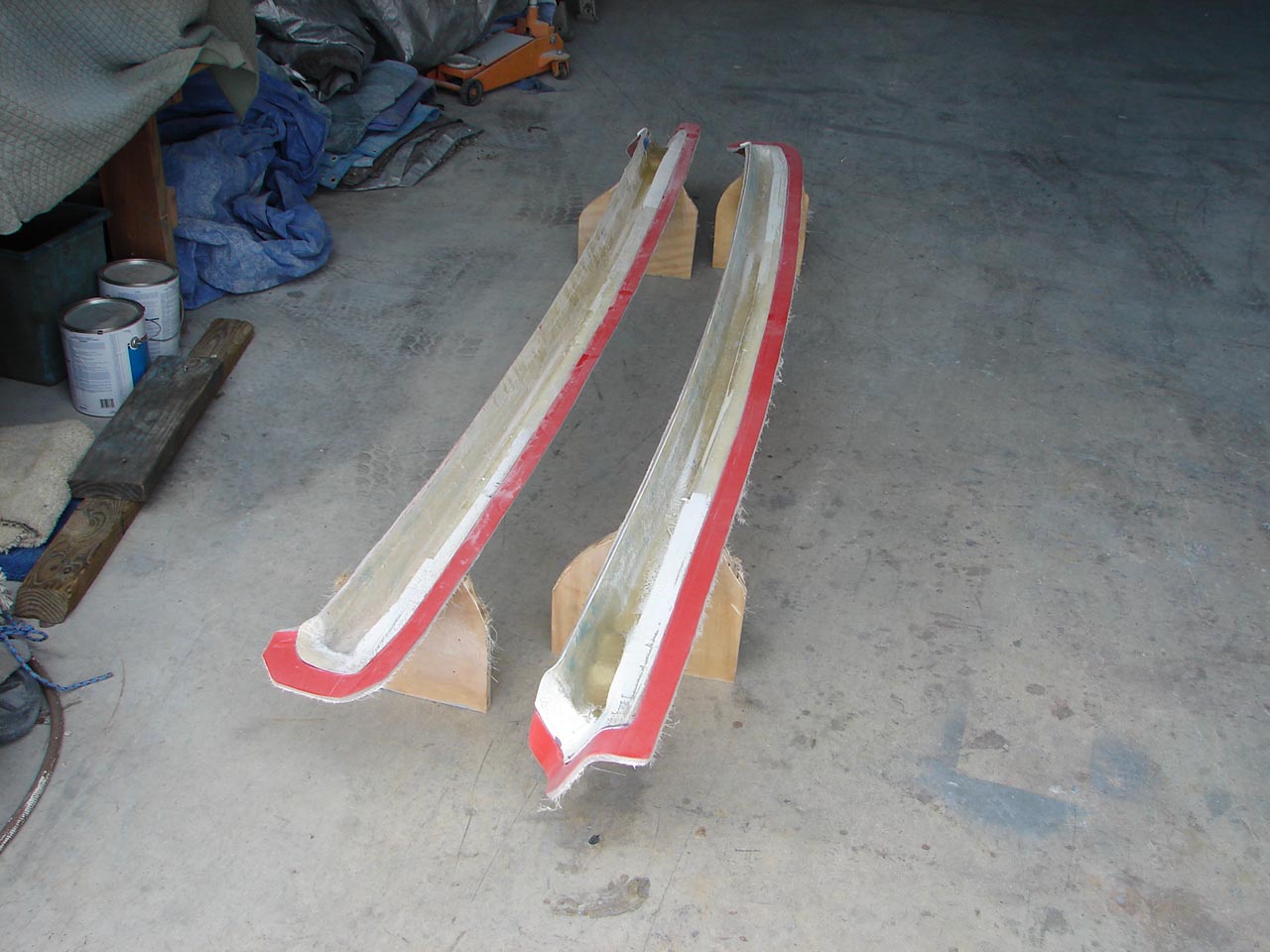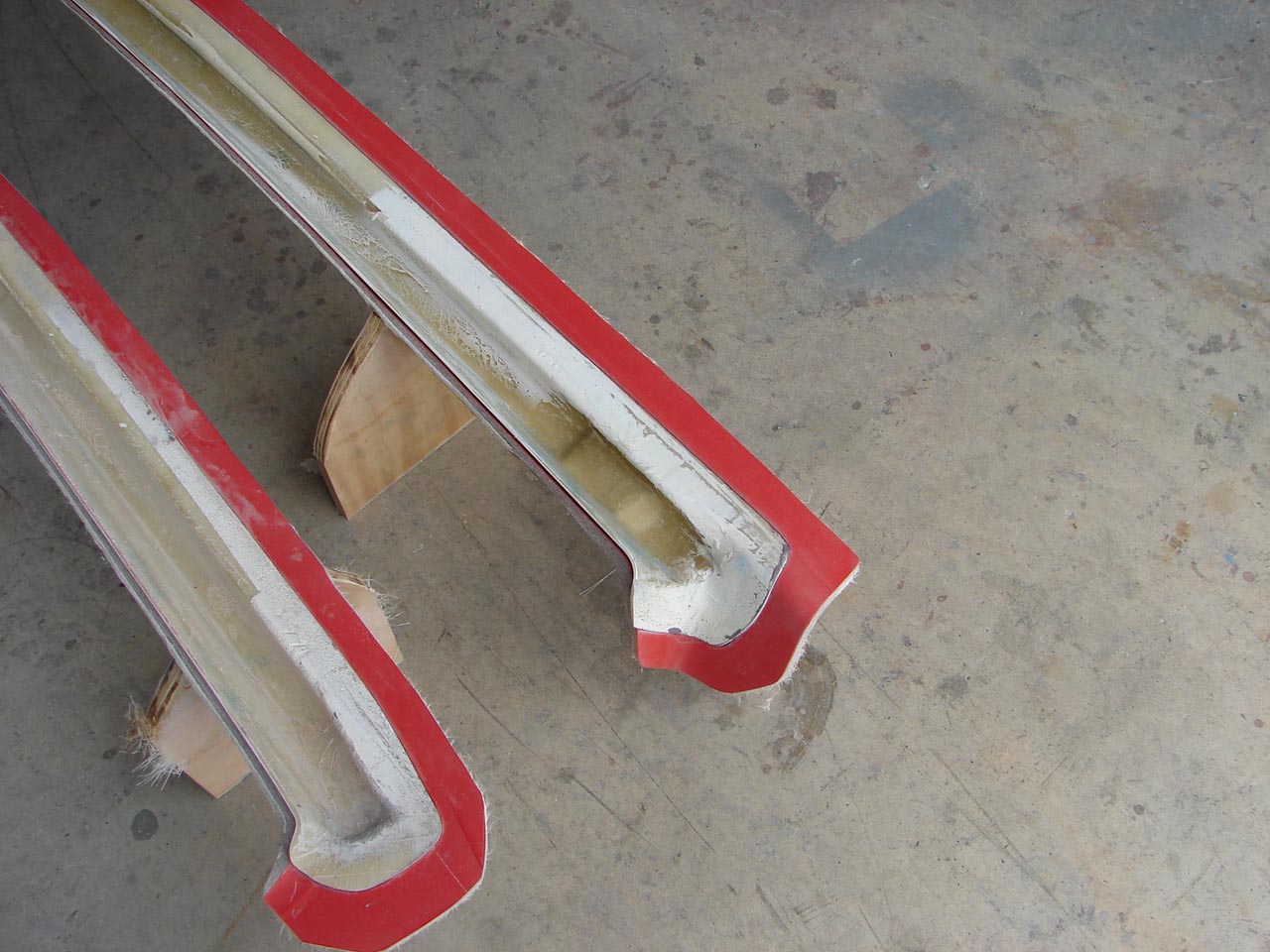 Structure So far I have only built a plug and a mold. I still need to finish the mold by removing a few high spots, polishing it, and waxing it. I believe the laminate will consist of white gelcoat, a thin back up layer of resin and 1/32 inch milled fibers to prevent tiny voids from breaking out, 3 layers of 1.5 ox mat and two strips of 6 inch wide 10 ounce cloth. The cloth would overlap about 3 inches in the entire center of the length of the part. I also plan to install a backing plate pre-tapped for #10 fasteners appropriate for a Harken 150 cam cleat. (or maybe just include the preinstalled cleat)