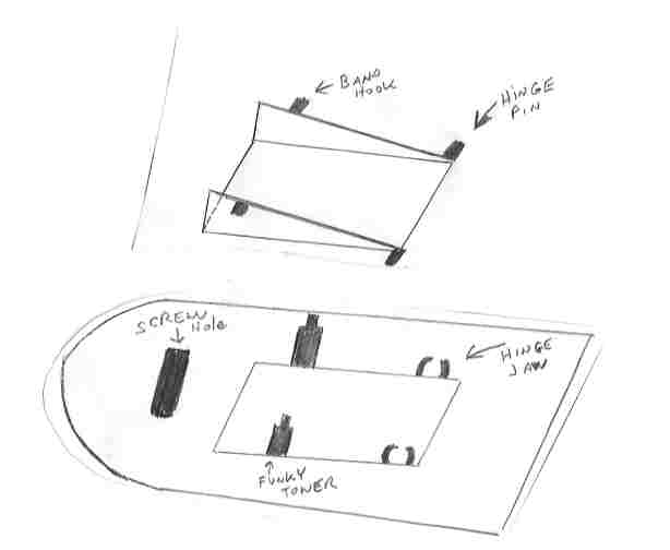The "hinge pins" snap into the "hinge jaws." The two rubber rings hook over the "band hooks" and the "funky towers."